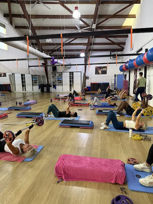 Chaque séance combine des mouvements simples avec une barre, des haltères et des disques, le tout rythmé par une musique entraînante et l’énergie du coach.